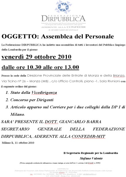 7/10/2010 CONVOCAZIONE ASSEMBLEA DEL PERSONALE DI DIRPUBBLICA PER IL 29/10/2010